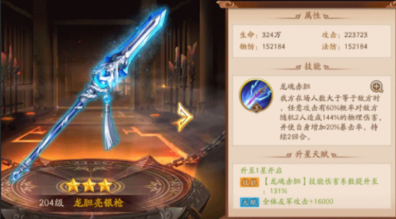 龙胆亮银枪是貂蝉的次选神兵,尤其适合补充爆发伤害。该神兵能提升暴击率并随机攻击两名敌人,与貂蝉对低生命值目标的额外伤害机制形成联动。尽管当前版本中龙胆枪的输出优势被青釭剑等新神兵稀释,但其培养门槛较低,仍是平民玩家的实用选择。龙胆枪可通过心愿商店每日兑换9片碎片,建议搭配马超或典韦等武将形成连携。