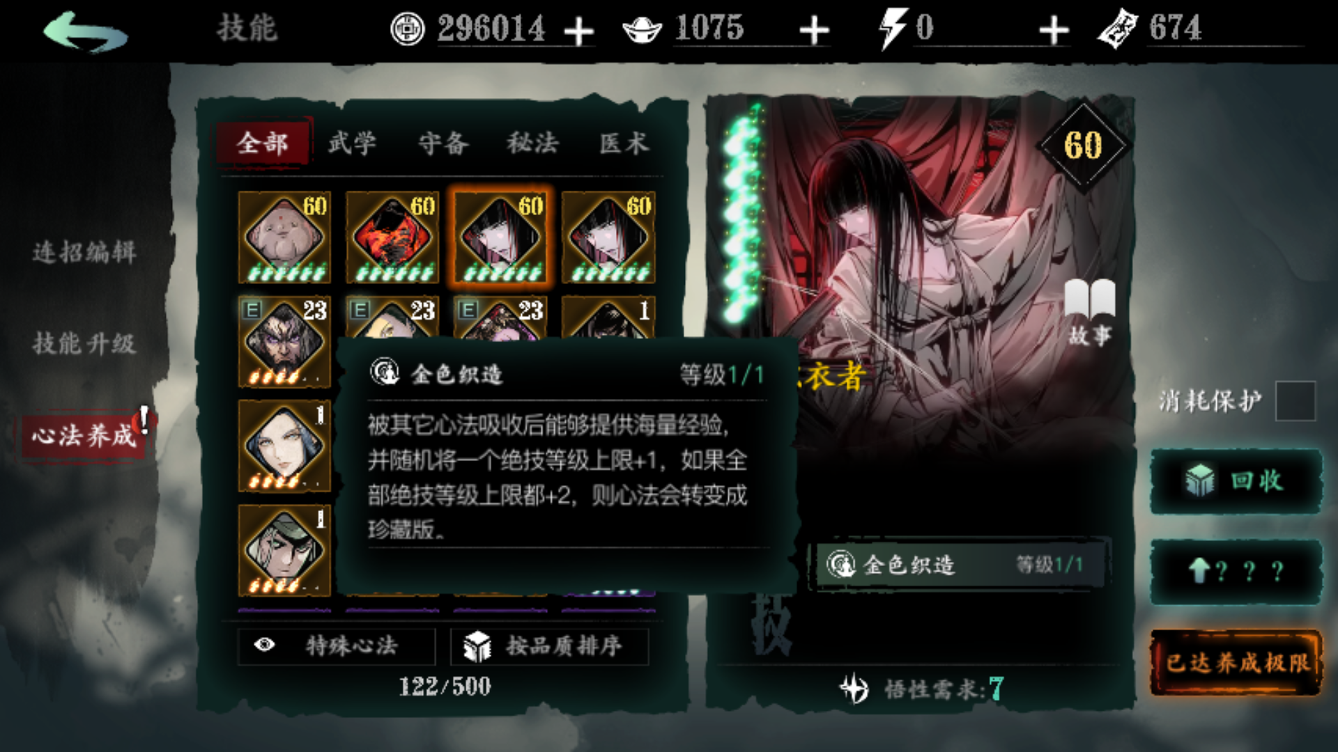 第二种方法依赖特殊心法织衣者。若未直接获得珍藏版心法,玩家需对普通心法使用织衣者提升绝技等级上限。具体步骤为:先使用1张织衣者激活绝技强化路径,待三条绝技均满级后,再消耗6张织衣者(总计7张)将心法进阶为典藏版。此过程需严格按顺序操作,且织衣者作为稀有资源需通过活动或商店获取,建议优先用于核心输出或防御类心法。