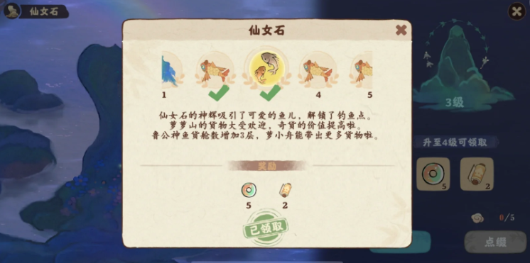 清理云雾需要用到一些工具,比如铁犁、铁锹之类的,记得提前准备好哦。攒够3个水云石后,直接点击仙女石升级就行啦,升到二级后还能拿到2个建筑卷轴和5个玎当作为奖励,挺划算的。升到二级后,仙女湖的玩法会变得更丰富,因为这时候会解锁鲁公神鱼。鲁公神鱼可是个好东西,它能帮咱们运送货物,后面升级货舱还能提高运输效率。所以早点把仙女石升到二级,对咱们的发展帮助很大。