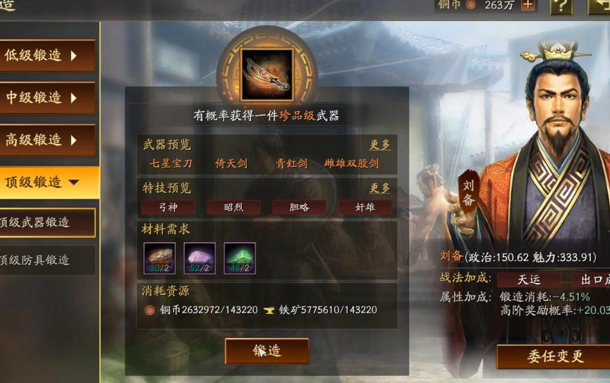 首先用中级或高级锻造连续打造几次普通装备(绿装或蓝装),如果连续几次未出稀有装备(紫装或橙装),再切换到顶级锻造。顶级锻造建议一次性打造两到三次,不要频繁切换界面或连续点击,间隔几秒再操作。如果使用图纸锻造,建议将图纸放在最后一锤,这样出特技的概率更高。锻造过程中可以委任高魅力武将如曹植、步练师担任锻造官,他们的技能能进一步提升高阶装备的产出率。