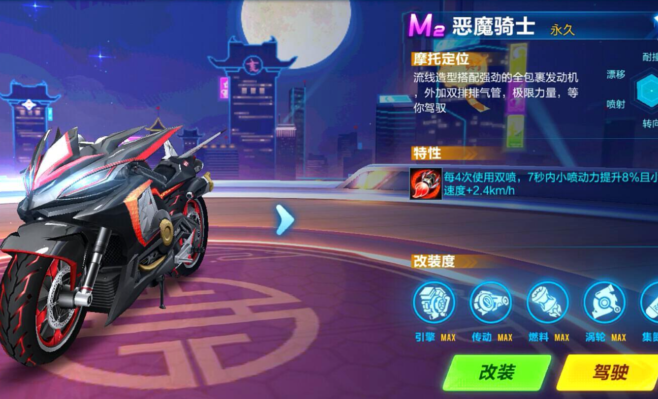 摩托车分为M1和M2两个等级,M1的性能接近B车,而M2则能和A车一较高下。它们的最大特点就是拥有专属的抬头喷技能,在氮气状态下点击刹车键,车头会高高抬起,牺牲一点氮气时间换来更强的冲刺速度和爆发力,特别适合短直道超车或终点冲刺。
