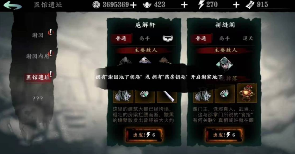 拿到钥匙后直奔谢家地下副本,这里能刷到不错的装备和材料。药房区域有很多隐藏互动点,比如角落的草药柜和墙上的机关,记得多转转别漏掉好东西。钥匙是一次性消耗品,但副本可以重复挑战,每次进入都需要重新获取钥匙,所以平时看到黑市商人有卖钥匙的话可以囤点备用。