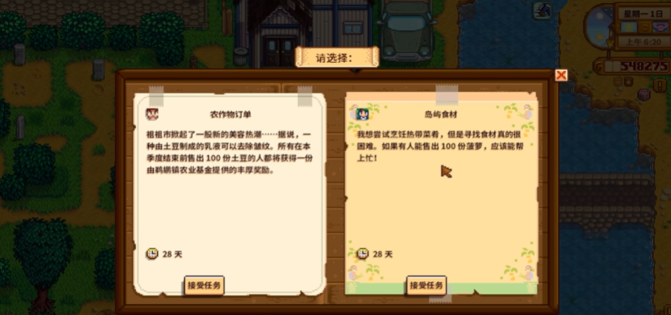 高级任务通常指那些难度较大或需要特定条件触发的挑战,比如特别任务板任务、法师任务、姜岛隐藏任务等。特别任务板位于鹈鹕镇镇长刘易斯家门口,第一年秋季第二天才会开启,每周一会刷新两个任务,但只能接取一个。任务期限从7天到28天不等,如果没完成可以重新接取,但已提交的物品可以在镇长家的失物招领箱找回。这些任务的奖励包括稀有配方、好感度提升和特殊物品,比如罗宾的硬木任务能解锁豪华双人床,而社区清理任务能拿到纤维种子配方。