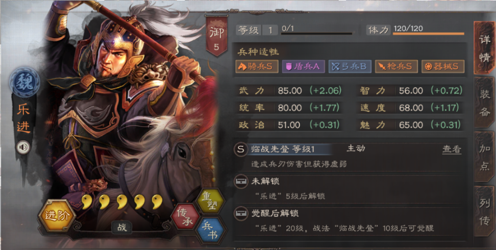 勇者得前作为突击战法,具有45%的高发动率,其核心价值在于攻守兼备的双