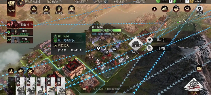 攻城的具体执行需要精细计算部队到达时间,主力队伍最好同一秒压到城下,先用高输出武将配合器械削弱城墙防御,减少后续进攻难度。拆迁队则稍晚进场,专门负责消耗城墙耐久度,注意控制节奏,避免过早消耗兵力。攻城值高的武将如木鹿大王、于禁等能加快拆墙速度,合理利用战法如毁墙或云梯也能提升效率。在耐久度快见底时全力输出,确保一举攻破。