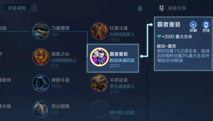 到了游戏中后期,最后一件装备的选择往往决定了你最终的身板。霸者重装是个非常稳妥的选择,提供巨量的生命值,并且脱战后的回复能力能让你减少回家补给的次数,可以一直跟着团队防守或者寻找机会。如果你觉得团队实在缺伤害,也可以考虑出一件暗影战斧,但前提是你真的能站得住。更极端一点的保命选择是血魔之怒,这件装备的主动技能可以用部分当前生命值换取一个厚的护盾,非常适合夏侯惇这种技能有护盾、被动能回血的英雄,能在关键时刻让你多抗好几秒,为队友创造输出时间。金身(贤者的庇护)也是可选项,但要注意它的冷却时间很长,用掉一次后要学会及时换成其他防御装。