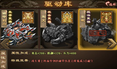 通过反复改装,玩家可以将烈焰战车提升至满级状态,从而获得显著的基础属性增益。改装满级后,战车在未装配零件时基础属性加成包括2050点攻击、1196点防御、3216点血量、5.5级暴击和3300点破甲。驱动系统作为辅助部分,能赋予额外属性,例如蚩尤驱动提供250攻击、120防御和400兵力加成,但驱动的获取和优化独立于核心升级流程。