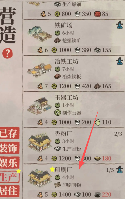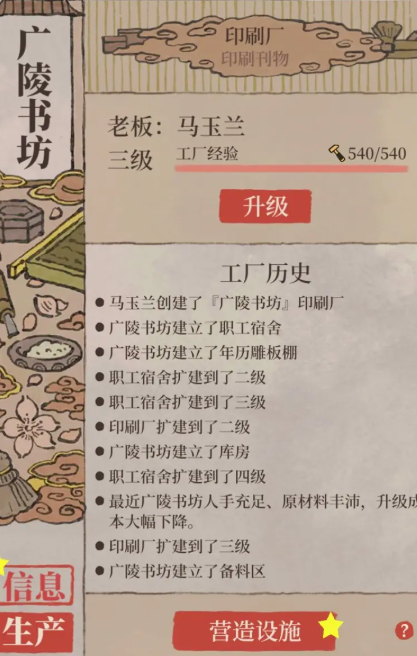 经书的生产是通过扬州府的印刷厂实现的,玩家需要进入扬州府区域并在营造菜单的生产类别中建造印刷厂,这是获取经书的主要途径,印刷厂最多可以建造五个,初始建造后需要逐步升级设施才能开始经书生产。要开始生产经书,玩家首先需要在印刷厂内建造职工宿舍和年历雕板棚,通过生产年历来积累经验值,从而将印刷厂升级到二级,升级过程中需要注意合理布局,因为一级印刷厂的空间有限,可能无法同时容纳所有必要设施,因此建议优先建造职工宿舍以确保雕板供应充足。