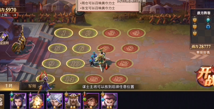 过召唤篇这一关,你得先搞清楚这关是让你熟悉黄巾流这套玩法的。这一关的过关思路其实挺直接的,就是需要你从系统给的武将里面,挑出几个特定的人来摆好阵型。你需要选的核心武将是盾兵张梁、步兵周仓和谋士张角,这三位都是能召唤黄巾力士的。然后还得再配一个能站在前面的武将,通常大家会用袁术来充当前排。选好人只是第一步,布阵的位置才是关键,你得把张梁和袁术这两个前排武将放在战场最上面那两排,这么做的目的是为了挡住对面冲过来的骑兵,保护好后排脆弱的张角和周仓,不让他们被直接切掉。只要阵型摆这关打起来就没什么太大难度了,主要是让你体验一下用人海战术的感觉。