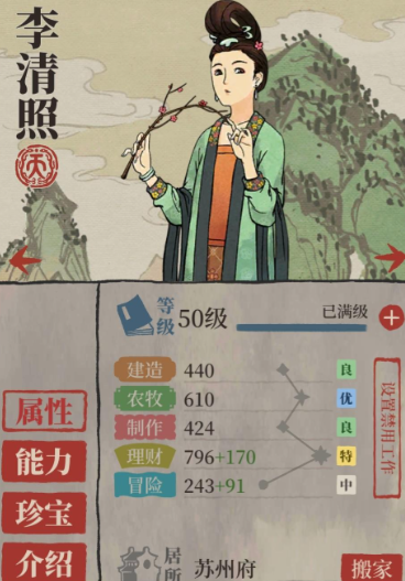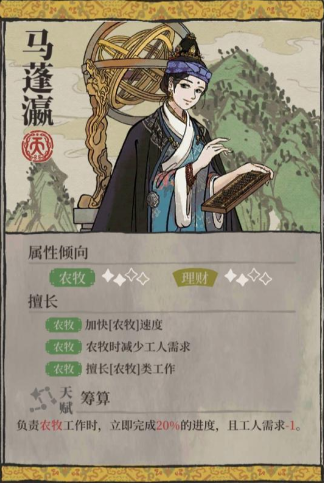 李时珍、沈恬和马蓬瀛是公认的天神级人物。他们的天赋主要围绕增加农作物产量和减少工作时间展开,能够确保粮食和原材料的高效稳定供应,是支撑整个城市运转的基石。例如李时珍,其农牧属性极强,搭配哮天犬等农牧类珍宝后,加成效果非常可观,是农牧工作的首选。玄奘(唐僧)的天赋可以在需要消耗菜肴的工作中节省30%的饭菜,这在资源紧缺的苏州府开荒阶段具有极高的战略价值,能有效缓解食物压力。