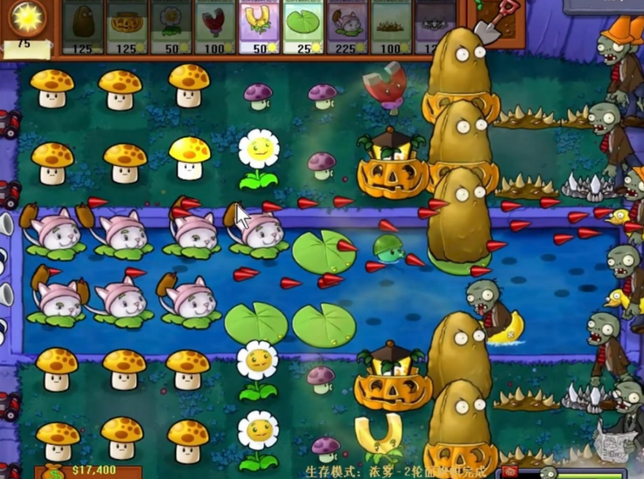 植物阵型部署需要分散布局以覆盖更大视野范围。推荐将攻击植物如豌豆射手、寒冰射手放在第二排,卷心菜投手和大嘴花放在第三排。水路防御建议使用香蒲,它能攻击全屏目标且对气球僵尸有效。忧郁蘑菇适合守卫河道口,高坚果则用于前排防御。随着关卡推进,要逐步将小喷菇替换为双发射手或机枪射手,提升火力输出。地刺和火炬树桩的搭配能有效应对车辆僵尸。