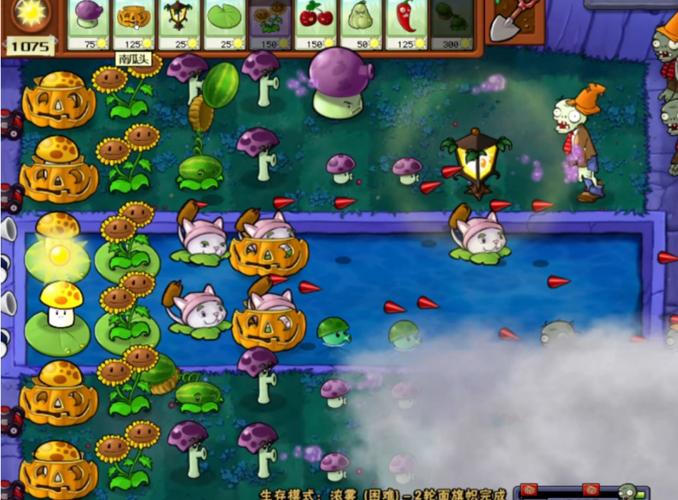 浓雾关卡的核心难点在于视野受限,玩家只能看到有限范围内的植物和僵尸。要顺利通关,必须优先选择能够穿透浓雾或自动攻击的植物,如卷心菜投手、大嘴花、路灯花等。路灯花是必备植物,它能永久照亮周围区域,消除雾气对视野的影响。建议将路灯花种植在中间靠前位置,既避免被僵尸过早吃掉,又能最大化照明范围。