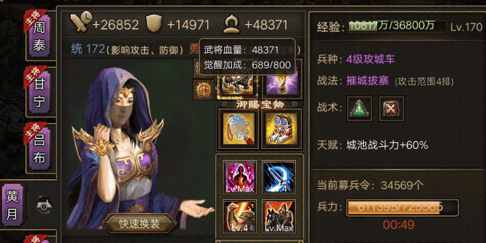 黄月英是输出的核心,建议带极灵龟和喷火车,御宝用红甲,勋章选最强的。她的喷火车加上曹操的血盾可以轻松打掉2-3个NPC,最后一排再放战法补刀。周泰负责收尾,带极霸下和方圆阵,兵书选强攻、强防和掌控类的。打完前面几个将后,周泰只要清理剩下的残兵就行,难度不大。