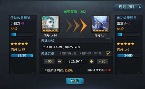 传递星级需要消耗通灵之魂,这个资源可以通过日常活动慢慢攒。每周能传9次,每周三凌晨刷新次数,传得越多消耗越大。具体算法分三段:前540个英魂收16.5%,中间部分收9%,超过3330的部分收6%。第一次传消耗最少,第九次就要多花近四倍资源,所以最好每周集中传一两次。传递时如果原来的英雄开启了天赋,天赋会被重置且不返还元宝,这点要特别注意哦。