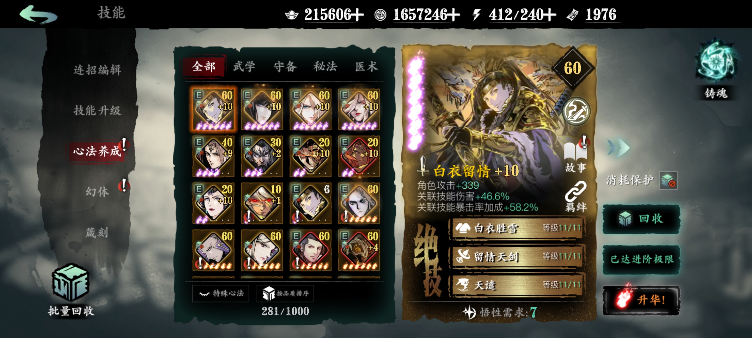 后期解锁最终铸魂星位后,你的心法将获得质变提升。这时需要更多高阶心法作为突破材料,平时抽卡时注意保留相关心法。铸魂系统与心法羁绊效果联动紧密,比如白衣留情与黑暗无情搭配时能激活额外加成,合理组合能让战斗力更上一层楼。