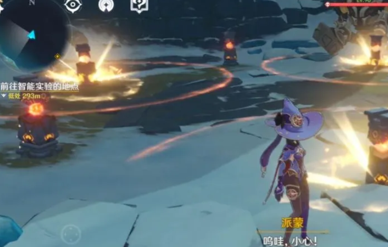 玩家需要同时激活两个火仙灵才能完成机关解谜。第一个火仙灵位于岩石山上方,靠近机关起始位置,触发后会沿固定路径移动;第二个火仙灵藏在水中央的台子上,需游泳接近并互动唤醒。两个仙灵最终需引导至指定灯柱内,当它们同时点亮对应柱子时,冰层封印会解除并出现宝箱奖励。该解谜的核心在于掌握仙灵移动规律与同步触发的时机。