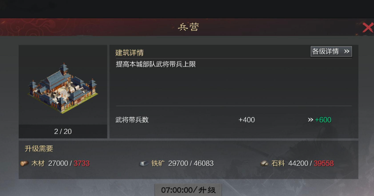 兵营建设是另一个关键点,升级兵营能显著提高单武将的带兵数量,每级增加200兵力上限。建议优先将兵营升至10级,后续每级提升的兵力增幅会更大。同时要记得同步升级募兵所缩短征兵时间,这样能保证兵力快速补充。预备役所也要及时建造,它能提高预备兵上限并减少回复时间,让你在战斗中随时补充损耗。