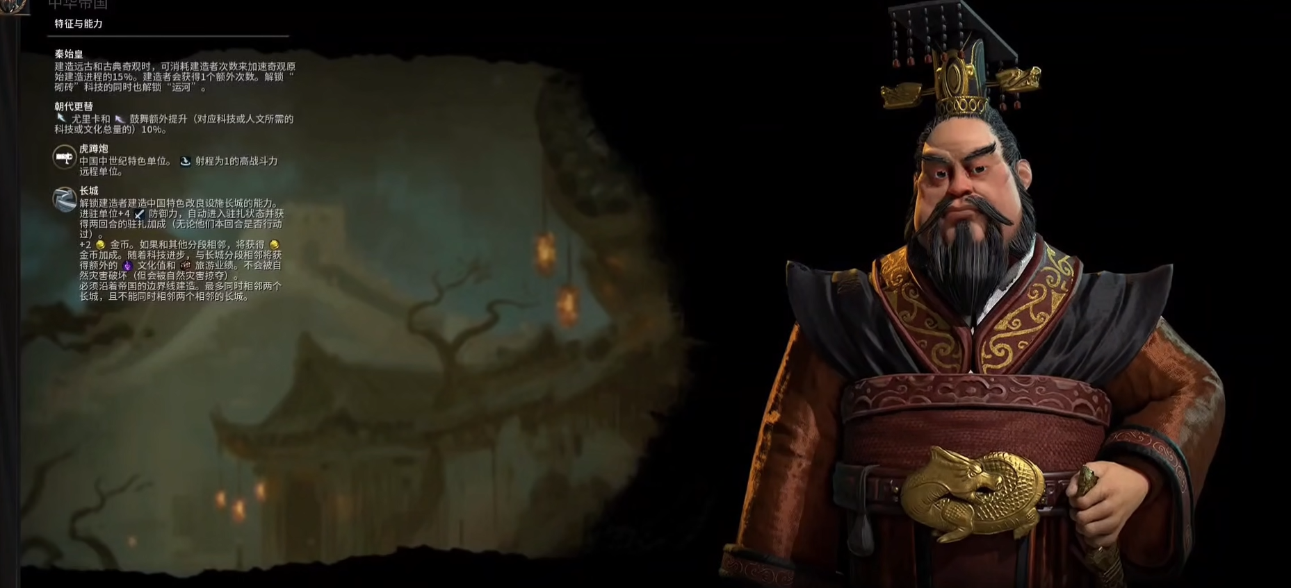 秦始皇作为中国文明的领袖,其特色能力始皇帝业和独特建筑长城构成了游戏中的核心优势。长城的战略价值主要体现在防御加成、文化产出和后期资源收益上,必须建在中国领土边界且不能与其他长城相邻。早期布局时需优先规划边境潜在冲突区域,利用山脉或河流等地形增强防御效果,同时注意城市间距以确保长城连贯性。长城建造需解锁石工术科技,工人需在空白边境格子分段建造,最终连接成完整防线。