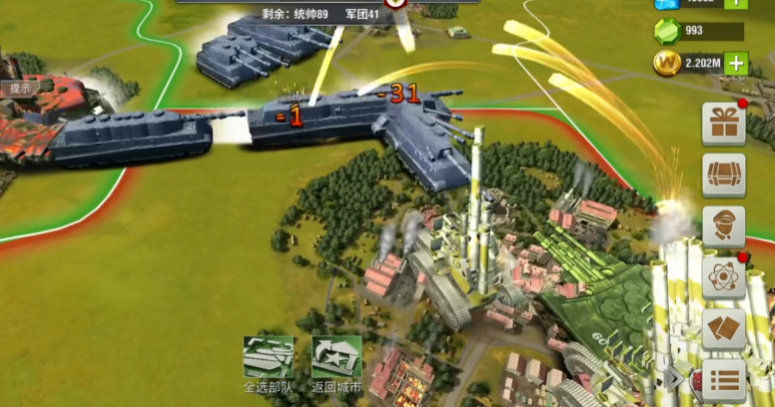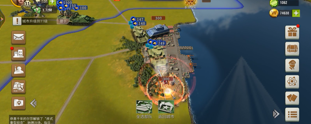 最终进攻巴黎时需避开初期直接攻击带名称的20级核心城,应先扫清周边未开盾的16-17级城市。攻城策略建议采用全军突击干扰射击等增益组合,同时用攻城武器削弱敌方建筑防御。若敌方有援军,需用侦察机提前预警并架设榴弹炮阻击。部队编制上,虎式坦克吸引火力后,用突击炮分编制拆解防御塔是常规战术。