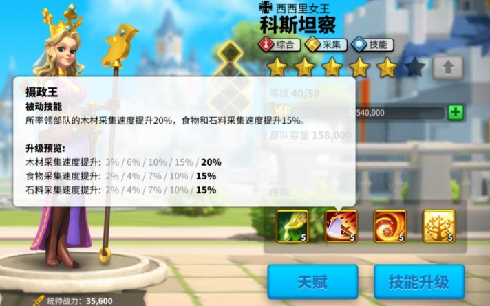 技能加点这块儿有门道,紫将普遍需要卡技能。比如孙武要先点满一技能再升星,贝利撒留的大招破防效果也得优先升级。贞德的群体buff技能升满后会有质变,而采集将像科斯坦察这种直接把采集天赋点满就行。注意每个将的强势期不同,像孙武是全阶段都能用,但有些紫将到后期就需要换成橙将了,所以金头要留给真正值得的武将。