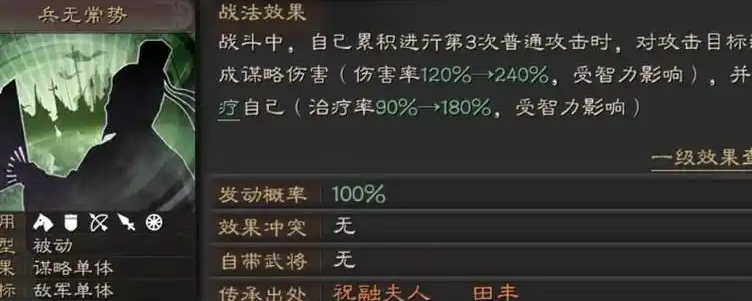 田丰的传承战法兵无常势是他战略价值的重要体现,玩家可以通过拆解武将来获取这个战法,它属于被动类型,在战斗中每进行第三次普通攻击时触发,对目标造成谋略伤害并治疗自己,伤害率和治疗率都受智力加成,这让它特别适合给智力高的武将使用,比如孙权等角色,兵无常势能提供稳定的输出和续航能力,尤其适合搭配在突击队伍中,一边打一边奶自己,保证了输出也维持了队伍的生存性,尤其在高智力队伍中能发挥更大作用,因为它不依赖发动概率,而是基于普通攻击的累积次数,所以在持久战中效果显著。