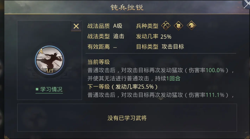 说到具体战法怎么带,公孙瓒在中军这儿一般不太指望他自个儿砍出多高伤害,主要还是当好辅助角色。最常见的就是配上攻其不备和浑水摸鱼这一套,攻其不备能稳步提高全队的伤害输出,浑水摸鱼则能提供混乱控制,刚好能补上公孙瓒谋略值偏低的短板,让队伍又硬又能打。要是没这些顶级战法,用长兵方阵搭上钝兵挫锐也挺实在,长兵方阵前几回合能给队友加分兵状态多蹭伤害,钝兵挫锐则能打出伤害的同时还带点控制,性价比挺高。还有些玩家喜欢让公孙瓒带怯心夺志和钝兵挫锐走双控路线,或者用勠力同心配合一个追击战法来进一步强化队伍输出节奏,反正核心思路都是让公孙瓒的战法增益效果最大化,同时给队伍添点控场或生存能力。