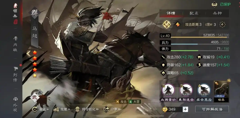 除了战法和阵容,细节调整也挺关键。加点方面绝大多数情况都得全力堆速度,确保公孙瓒能抢先手放战法,毕竟他技能效果受速度影响,而且抢到先手才能让队友的追击打得顺风顺水。兵种转轻骑兵或者弓骑兵都不错,轻骑兵的疾行特性进一步加强先手,出奇或者扰后也能根据对手调整。宝物选择上,带机敏词条的宝物能拉高主动战法发动率,让动如雷震更稳当,或者用无畏、钜黎这种增加追击伤害的宝物来间接提升全队输出。队伍站位一般让公孙瓒待中军,这样他战法三格距离能覆盖到前后队友,不过在某些极限爆头队里也会放大营带辅助战法,靠骑兵的移动能力去偷对面大营,玩法还挺灵活。