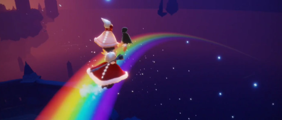 当你看到一道横跨天空的弧形彩虹出现,那就说明成功了。这时候动作得快一点,因为彩虹持续的时间大概就十秒左右。你需要操纵角色飞向彩虹桥的中间部分。彩虹只有桥身中间那一段是实实在在可以踩的,两边的边缘比较虚,踩上去会穿过去掉下来。靠近桥面时稍微调整一下飞行角度,轻轻地、稳稳地落在彩虹的弧面上。站上去之后别太激动乱蹦乱跳,慢慢走走是可以的,这样能保持平衡不容易掉。万一不小心滑下来了也只要彩虹还没消失,你完全可以立刻飞回去再试一次。