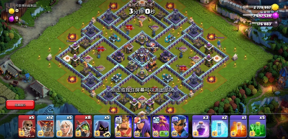 面对不同阵型需灵活调整打法,遇到大本营中置、防御密集的阵型,可搭配少量野猪骑士组成矿猪流,矿工抗伤吸引火力,野猪绕后拆除孤立防御,法术交替使用保证两支部队续航;日常资源掠夺可简化配兵,减少辅助单位数量,增加矿工比例,采用纯矿平铺打法,依靠治疗法术维持血量,快速收割资源建筑,降低造兵成本与进攻时间,超级矿工可作为援军或主力补充,爆炸伤害能高效清理密集建筑群,配合隐身法术可规避关键防御锁定,提升攻坚成功率。
