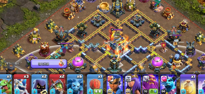 进攻操作严格遵循清边、前戏、主力推进、法术衔接的流程,先用少量法师、龙宝或亡灵清理阵型两侧外围建筑,防止大部队被引导至偏离核心的区域,清边完成后释放英雄与前戏部队,优先摧毁敌方援军城堡、核心防空或地狱塔,削弱敌方持续输出能力,前戏阶段把控英雄走位与技能开启时机,避免英雄过早被集火倒地,主力部队从清边完成的侧翼同步进场,沿着规划路线向大本营方向推进,法术根据防御伤害频率精准释放,治疗法术覆盖承受持续伤害的部队,冰冻法术锁定单头地狱塔、投石炮等高威胁防御,狂暴法术提升主力输出效率,全程保持部队密集度,防止分散后被逐个击破。
